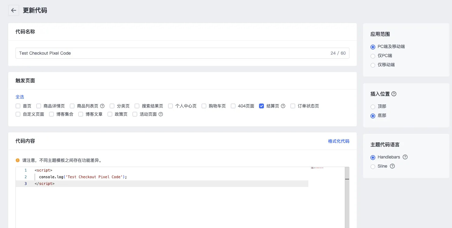 4.1. 添加代码,触发页面选择结算页,插入位置底部,语法选择 Handlebars