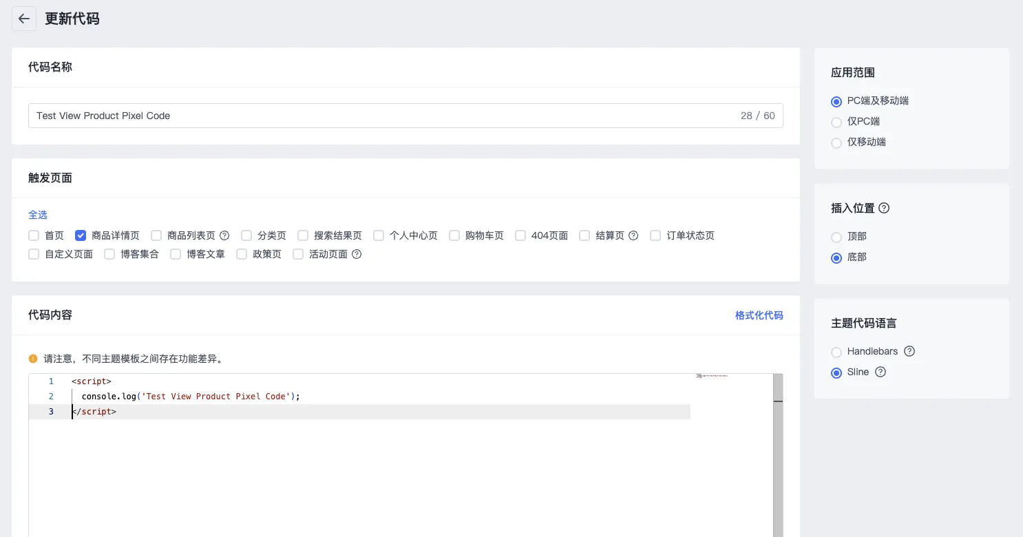 3.1. 添加代码,触发页面选择商品详情页,插入位置底部,语法选择 Sline