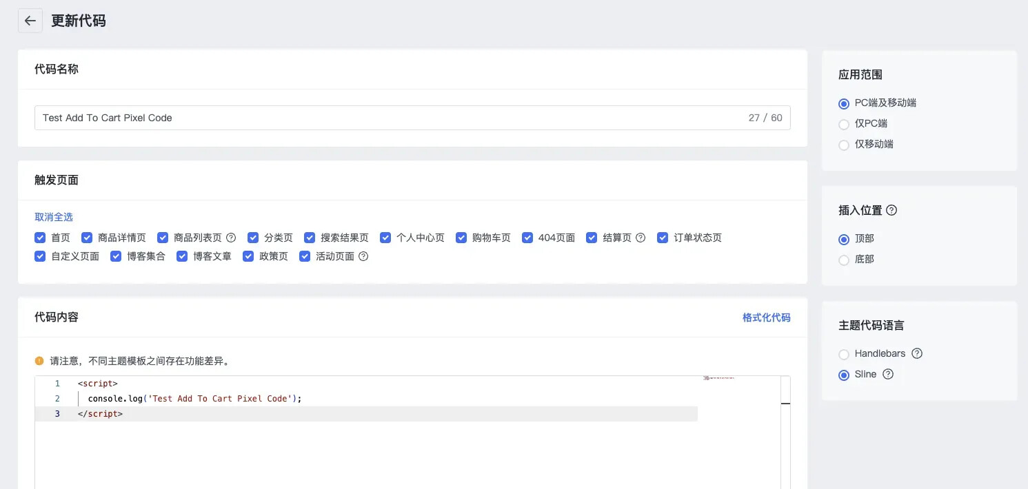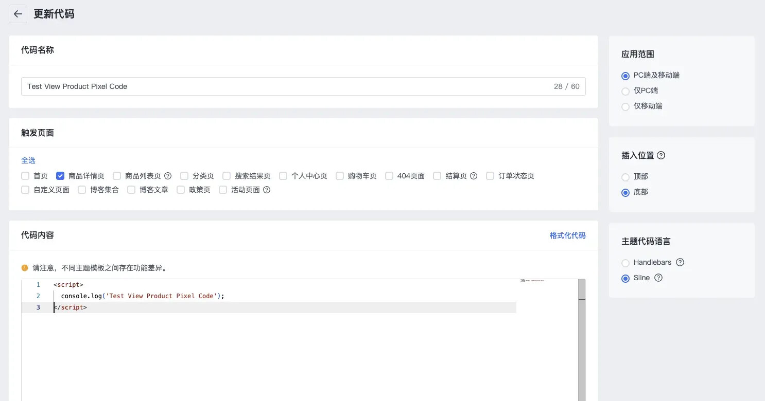 3.1. 添加代码,触发页面选择商品详情页,插入位置底部,语法选择 Sline