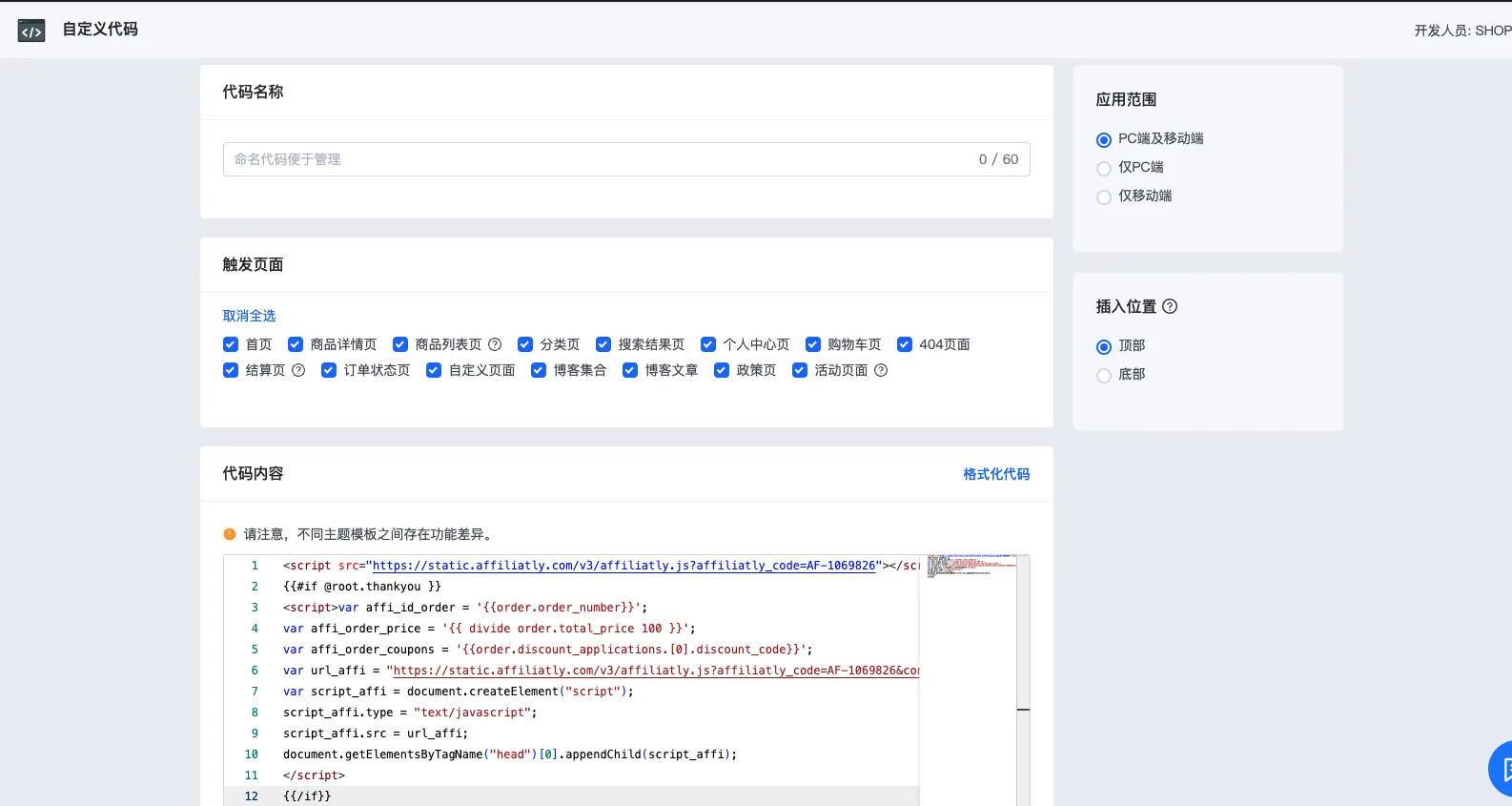 1. 在 Shopline使用「自定义代码」应用,点击添加代码