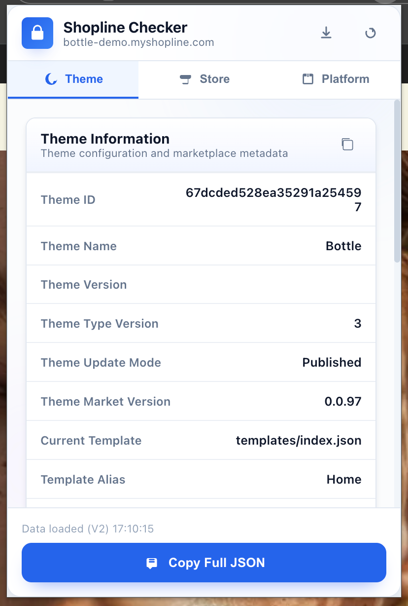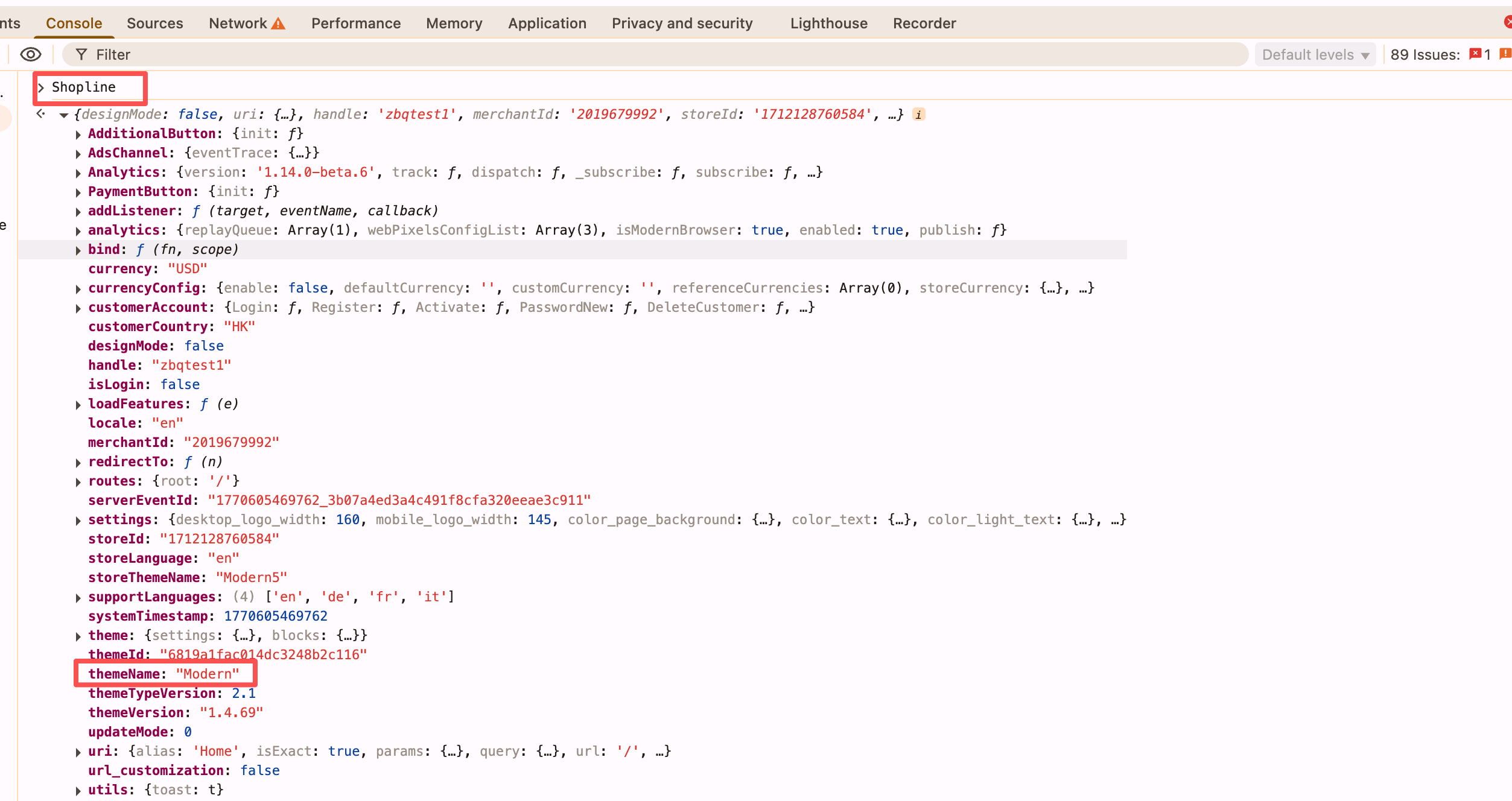 如果商家没有手动更该代码中的主题名称的话,可在C端页面唤起控制台,输入Shopline,可查看到店铺相关信息,其中有theme_name信息,如下图:
